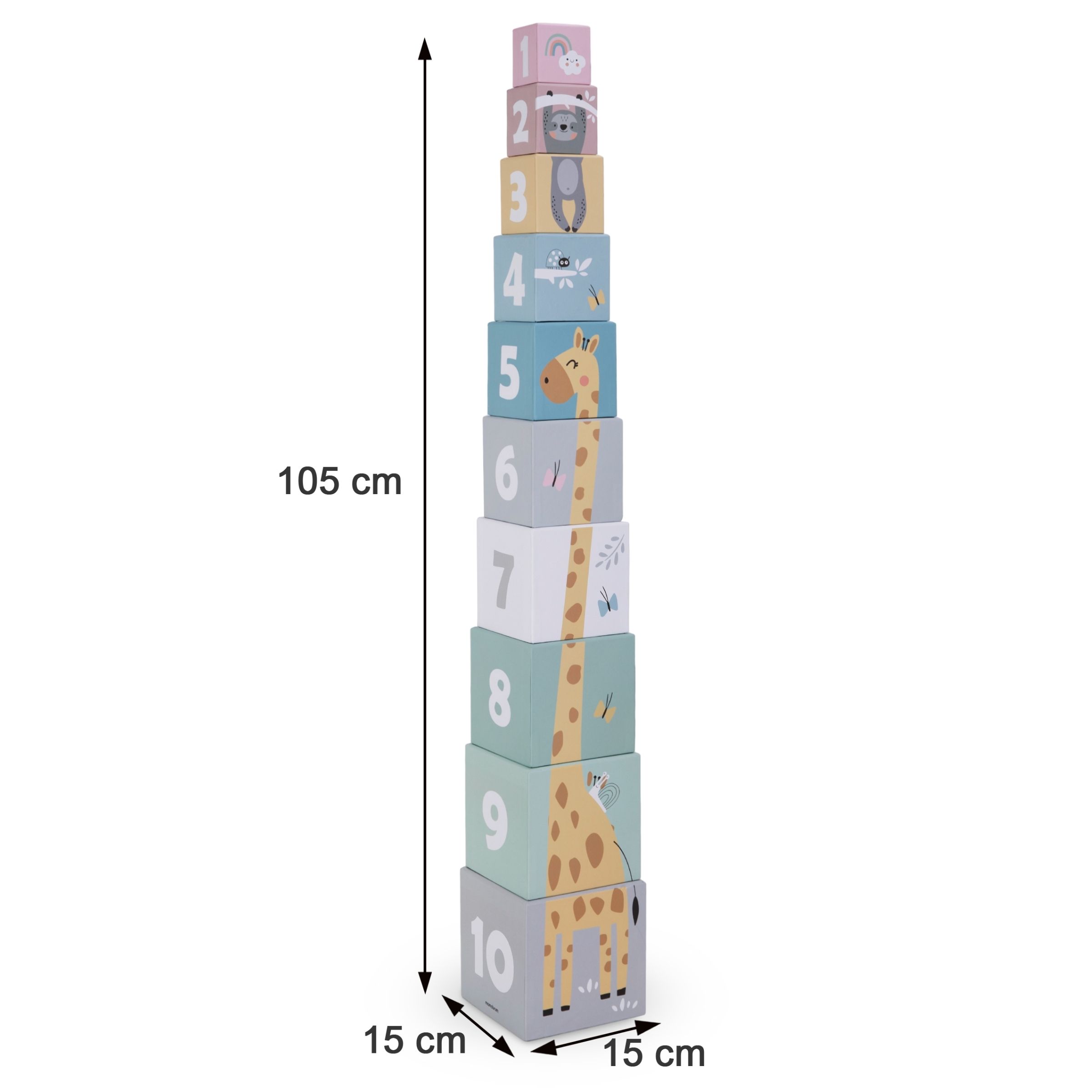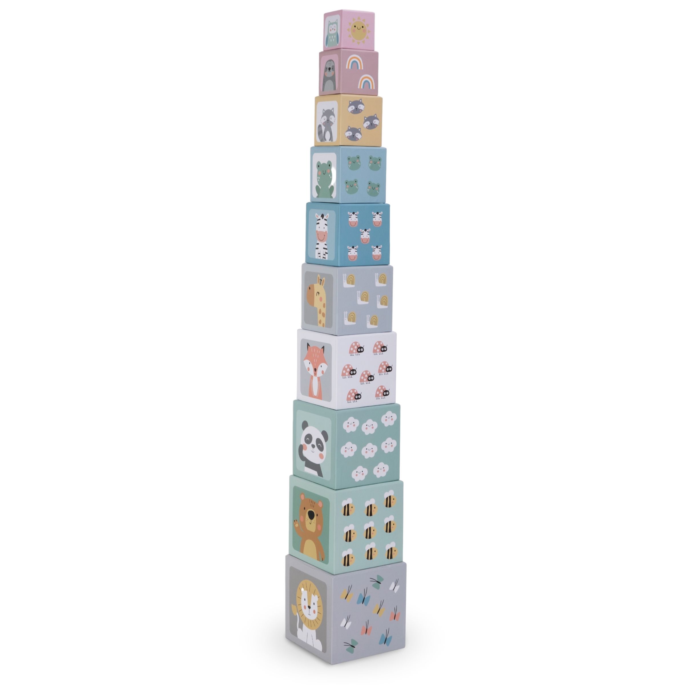 Кулата за подреждане се състои от 10 картонени кубчета с различни размери. Всичките им стени са украсени с цветен, привличащ вниманието принт. Малчуганът може да подрежда кубчетата едно върху друго и след това да разруши построената кула, което със сигурност ще му достави много забавления. Многоцветните блокчета несъмнено ще се превърнат в украса на детската стая. Благодарение на своя дизайн те ефективно ще привличат вниманието на малчугана.
