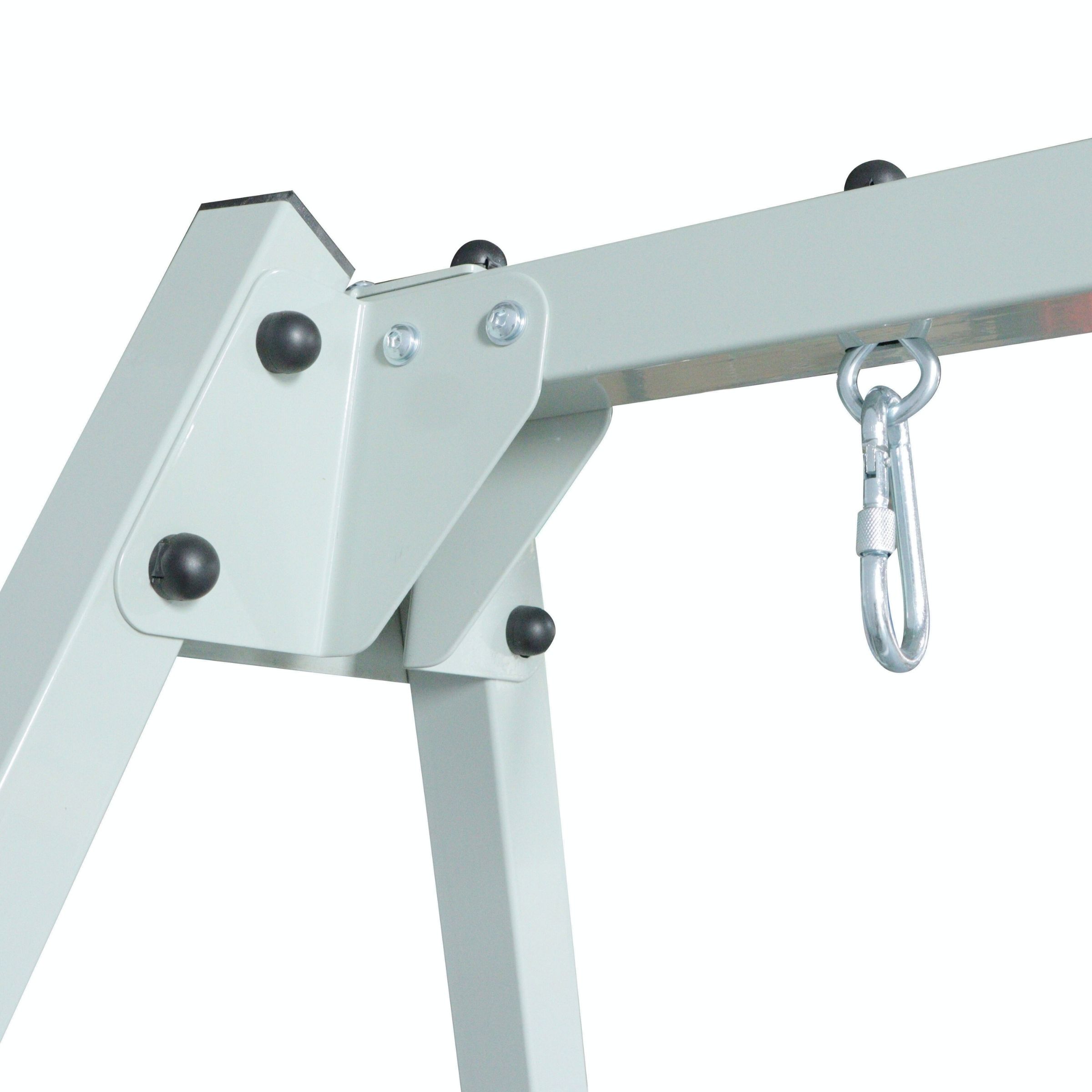 Стоманената стойка за люлка и хамак ще направи прекарването на времето на открито по-приятно за цялото семейство! Окачете на нея подходящите аксесоари, за да се забавляват както децата ви, така и вие. Благодарение на здравите куки можете лесно да закрепите люлка или хамак към рамката. Със своя непреходен дизайн рамката се вписва идеално, независимо от стила на вашата градина. Ако решите да закупите рамката, от вас ще зависи как ще изглежда детският кът за игра или кътътът за отдих на възрастните. В края на краищата една стоманена рамка може да се превърне както в център за забавление, така и в спокойно място за почивка. Каква ще бъде тя днес?