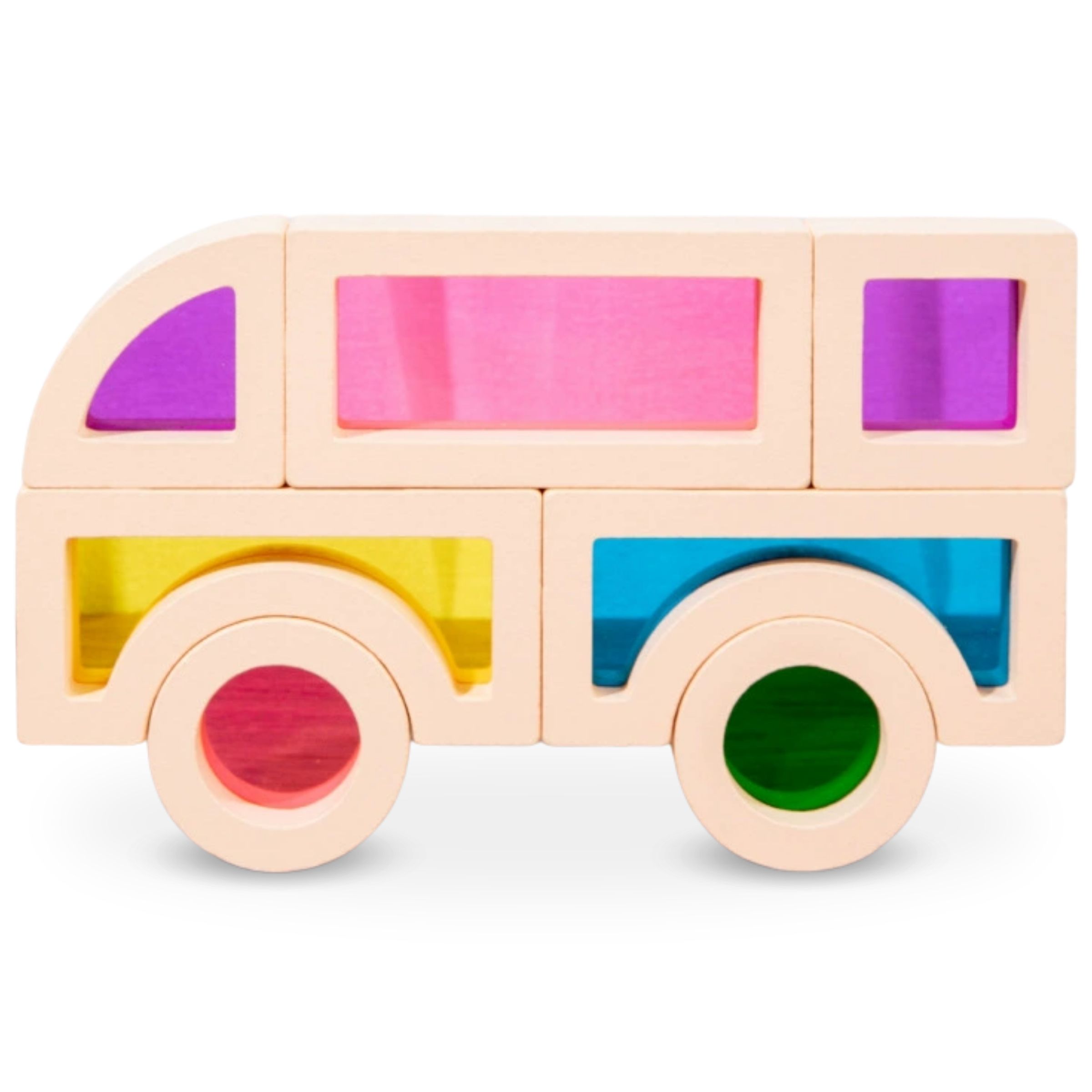 Дървените блокчета с цветни огледала са гаранция за фантастично забавление за всеки малчуган! Те могат да се използват за създаване на най-различни конструкции и същевременно за наблюдение на цветния ефект на полупрозрачните плочи в прозорците.