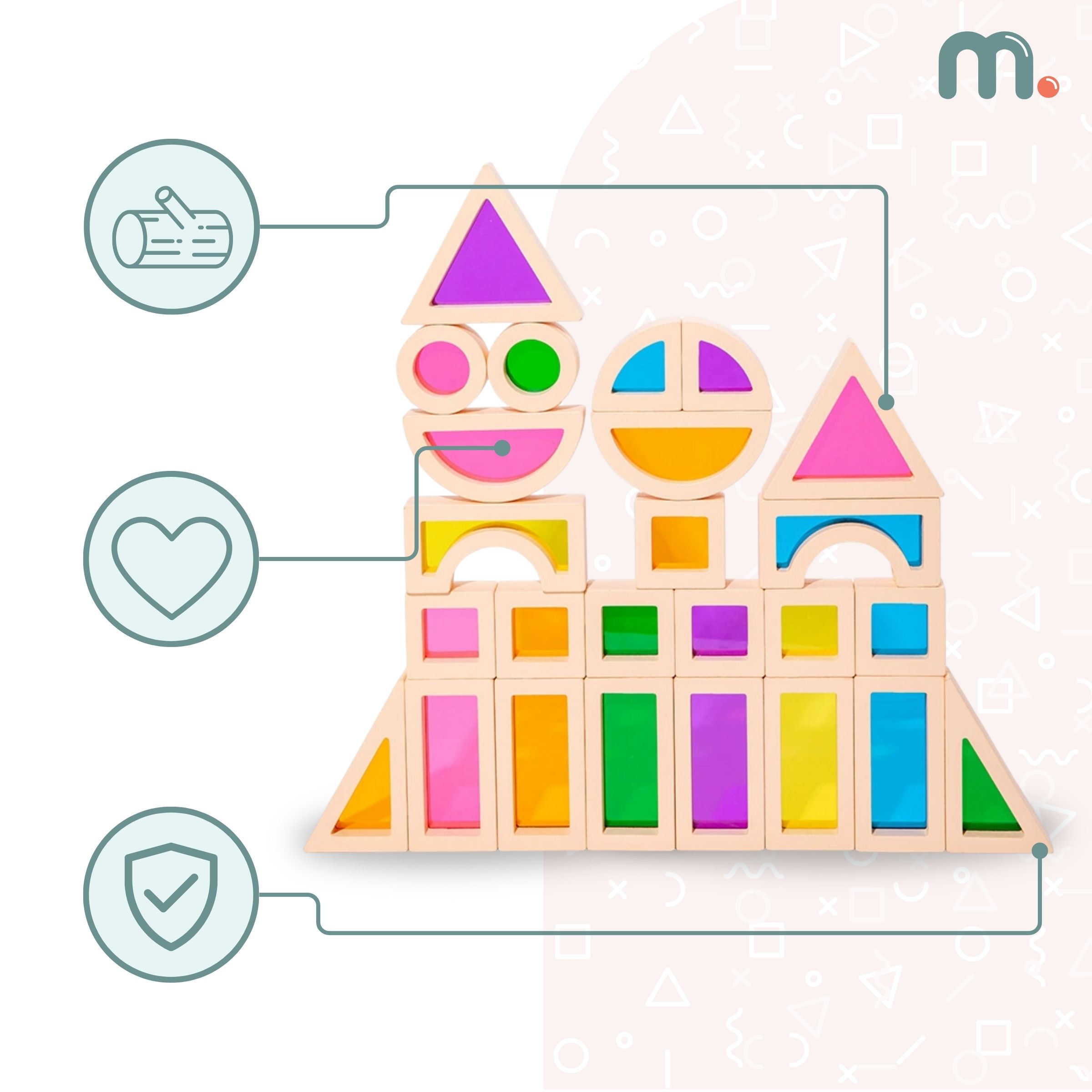Комплектът съдържа до 25 елемента с огледала с различни форми и цветове. Прозорците придобиват различни нюанси в зависимост от интензивността на светлината и броя на насложените блокчета. Това е фантастично забавление, а също и чудесно въведение в изучаването на цветовете и основните форми като квадрат, правоъгълник, триъгълник и кръг. С блокчетата на дъгата малчуганът може да открие света на цветовете и да му се наслади. Блокчетата могат да се използват както за забавление, така и за учене.