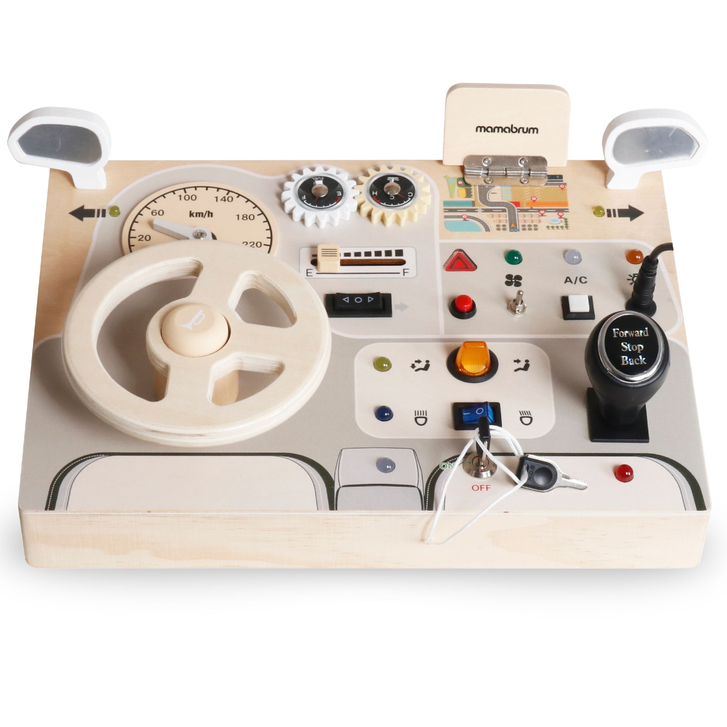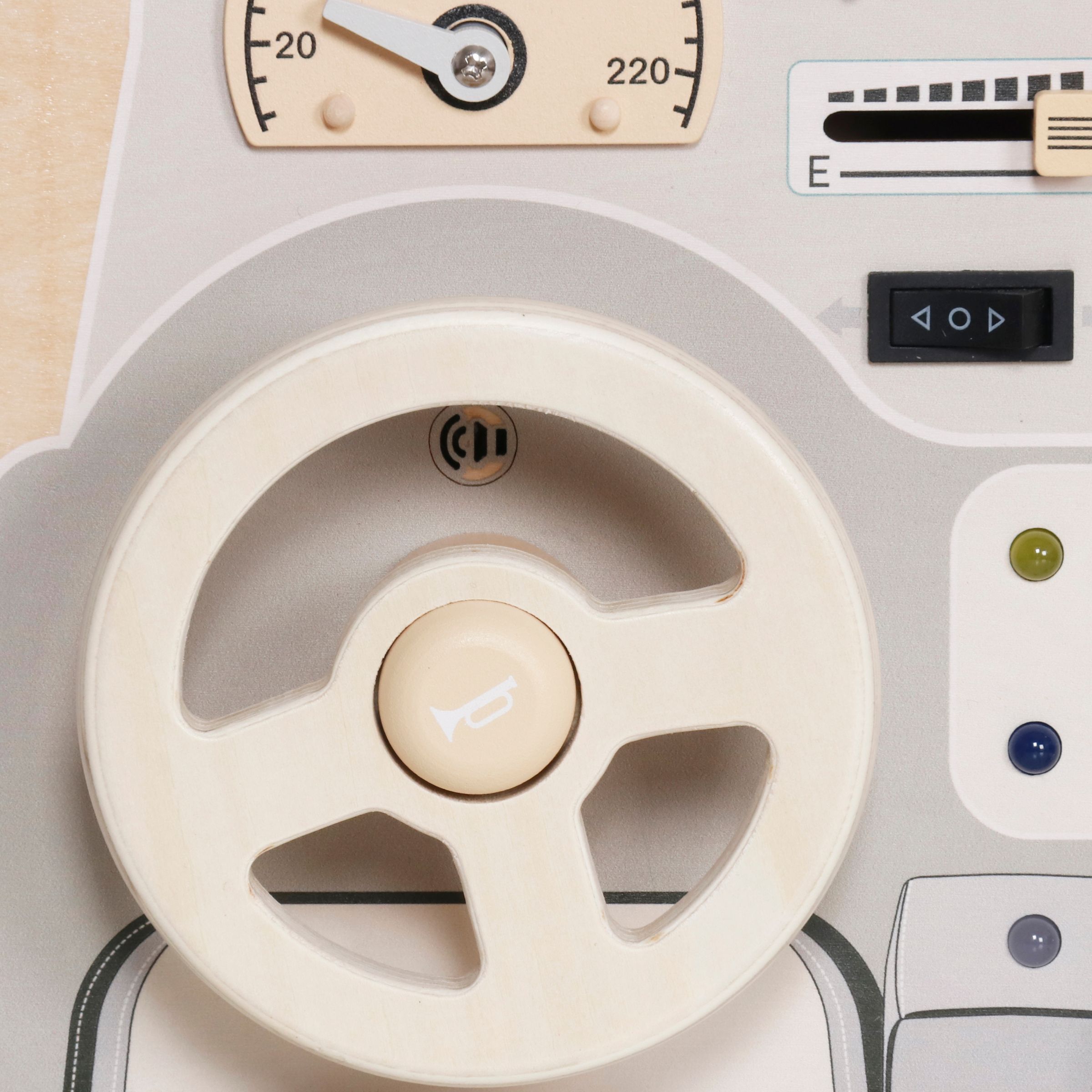 Дървената дъска стимулира детската креативност, като дава възможност за ролеви игри. Това е фантастичен подарък за всички малчугани, които са запалени по автомобилите и мечтаят да играят ролята на състезателен автомобил, шофьор на автобус или багер. Въображаемият дизайн насърчава творческата игра, а звуковите и светлинните ефекти допринасят за забавлението.