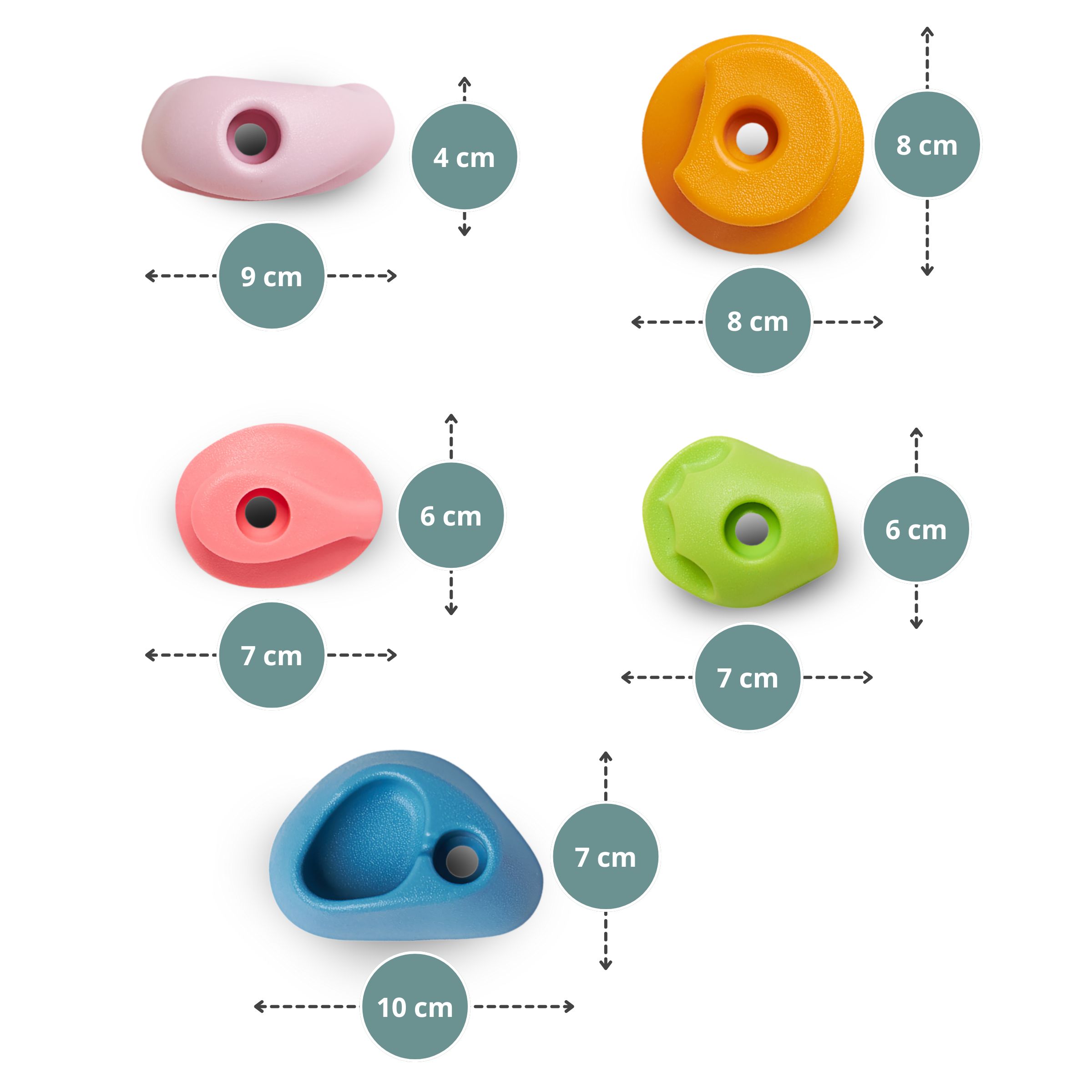 Регулирайте нивото на трудност на стената за катерене според текущите възможности на детето си. Можете да сте сигурни, че детето ви никога няма да се отегчи от стената за катерене. Когато препятствията станат лесни за детето ви, просто променете позицията на цветните дръжки, за да превърнете катеренето отново в предизвикателство. Това ще ви отнеме само няколко минути!