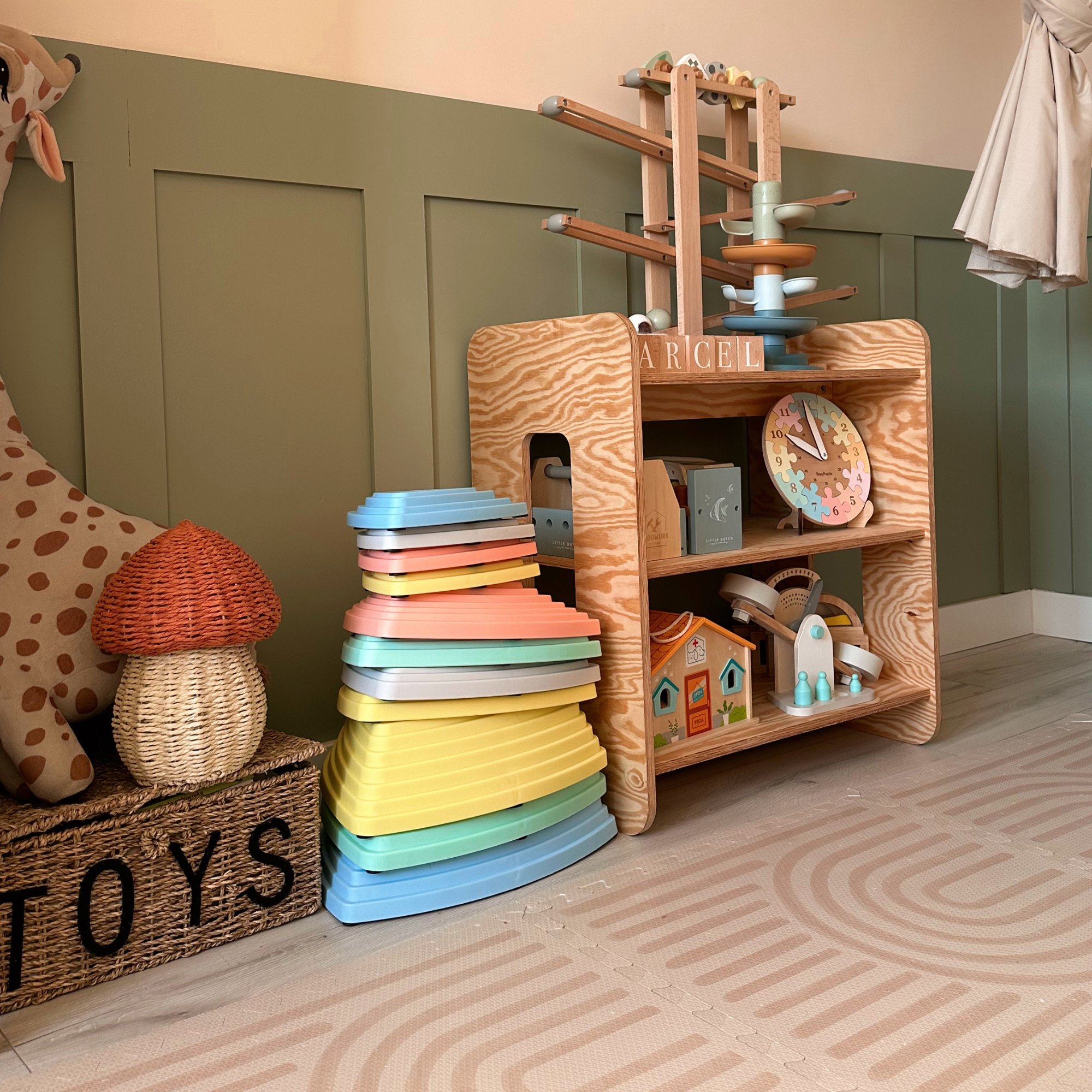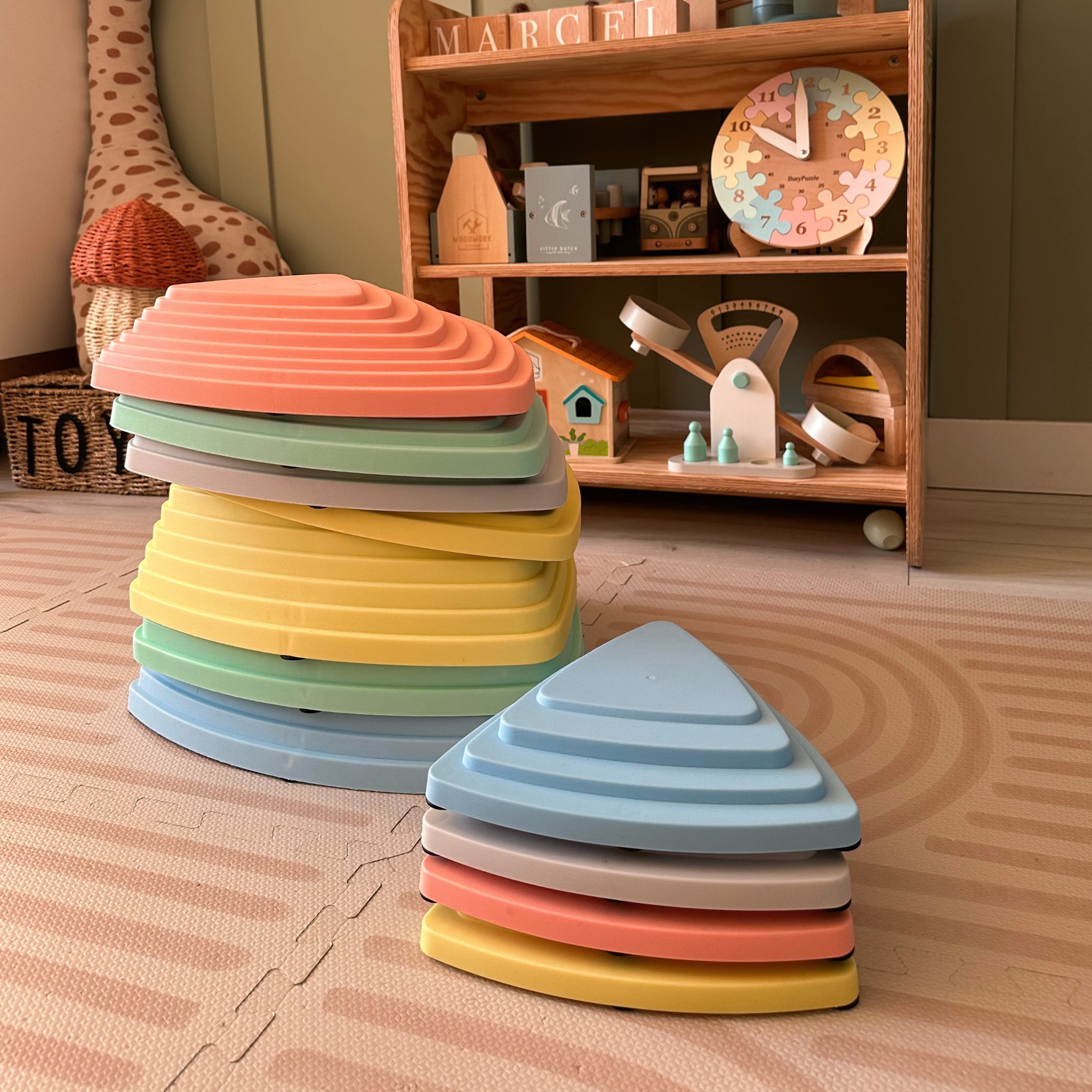 Наличен в пастелни цветове, комплектът от балансиращи камъни не само украсява детската стая, но преди всичко осигурява творческо забавление. Камъните могат да се използват по много различни начини в зависимост от текущите нужди и идеи на децата. Балансиращите камъни също така подпомагат двигателното развитие на малчуганите и им дават възможност да упражняват чувството си за равновесие.