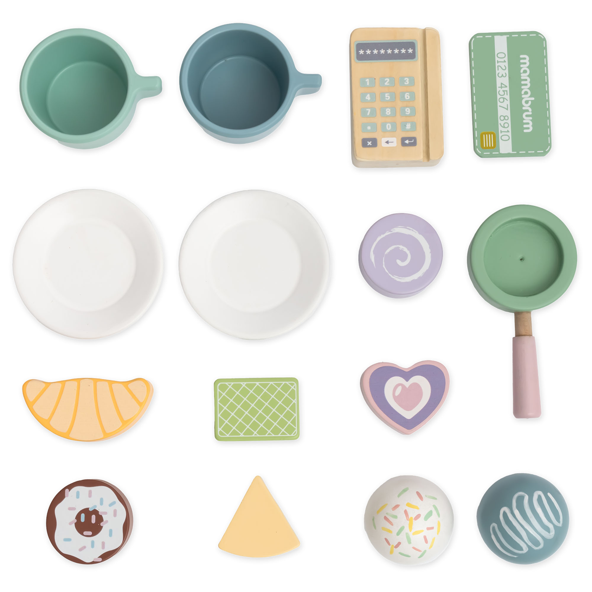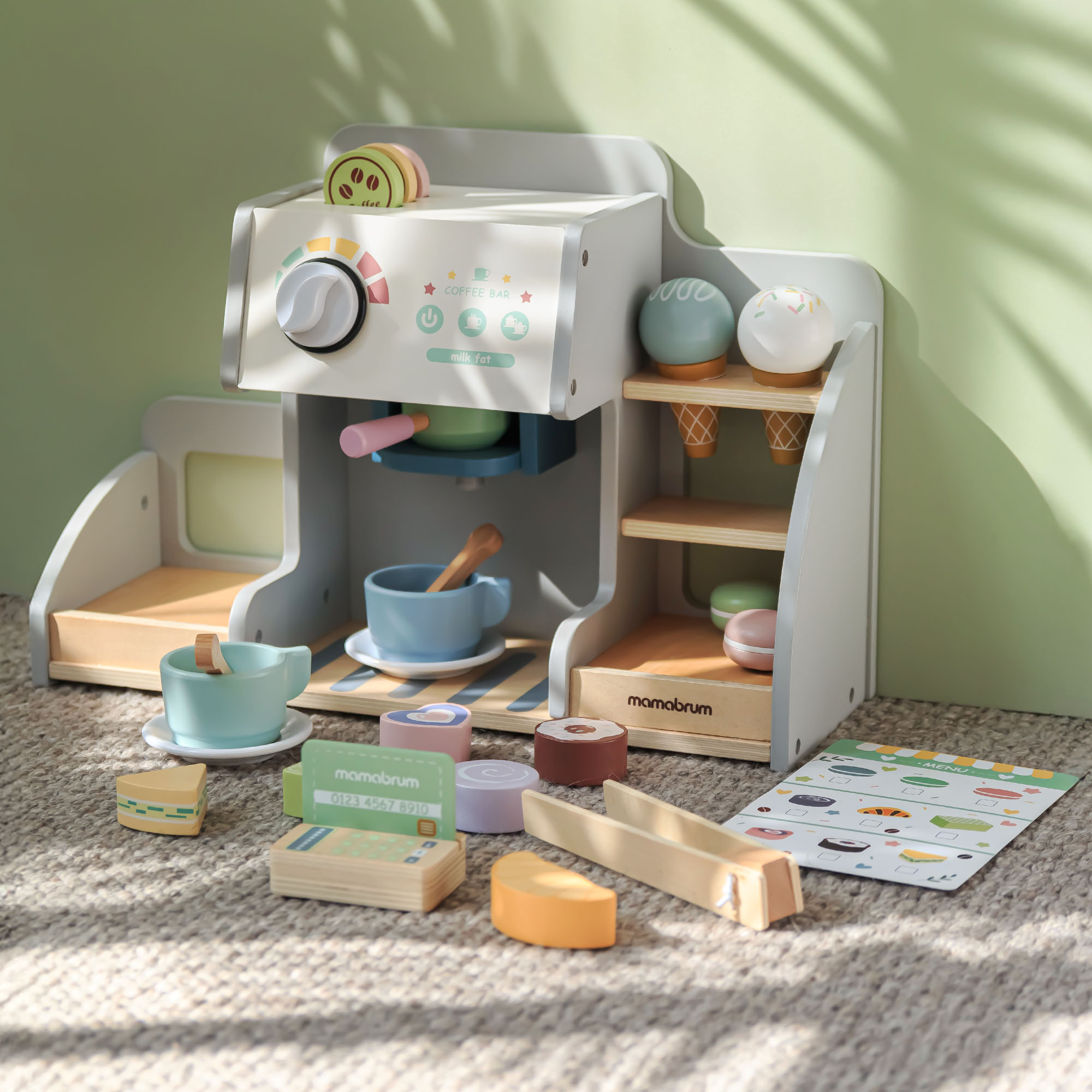 Оборудвано с множество аксесоари, кафенето е рецепта за творческо забавление. Комплектът стимулира детското въображение и се вписва идеално в декора на детската стая благодарение на меките си цветове и модерния си дизайн. Изработена от естествено дърво, играчката подпомага развитието на социалните, двигателните и познавателните умения на малчуганите. Благодарение на разнообразните елементи и реалистичните функции - като щракащия циферблат на кафемашината - играта може да изглежда различно всеки път.