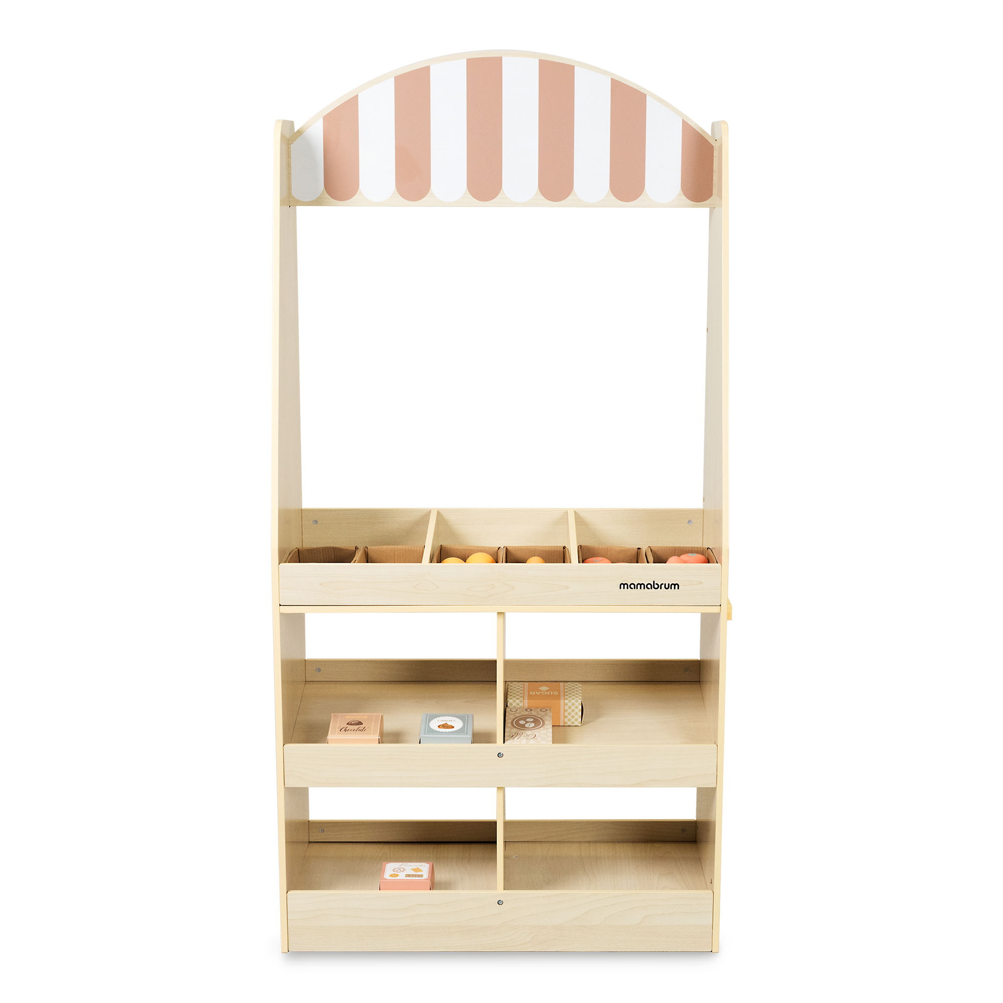 Превърнете детската стая в оживен супермаркет! Дървеният магазин Mamabrum е истински център за творческа игра, където малчуганите могат да поемат ролите на продавач или клиент. Реалистичният му дизайн , големият надпис SUPERMARKET и практичната дъска за писане на цени или промоции ще накарат децата да се чувстват сякаш са в истински магазин . Това е чудесен начин да развият въображението си, да се научат да броят и да практикуват социални умения – всичко това чрез забавление, което никога не остарява!