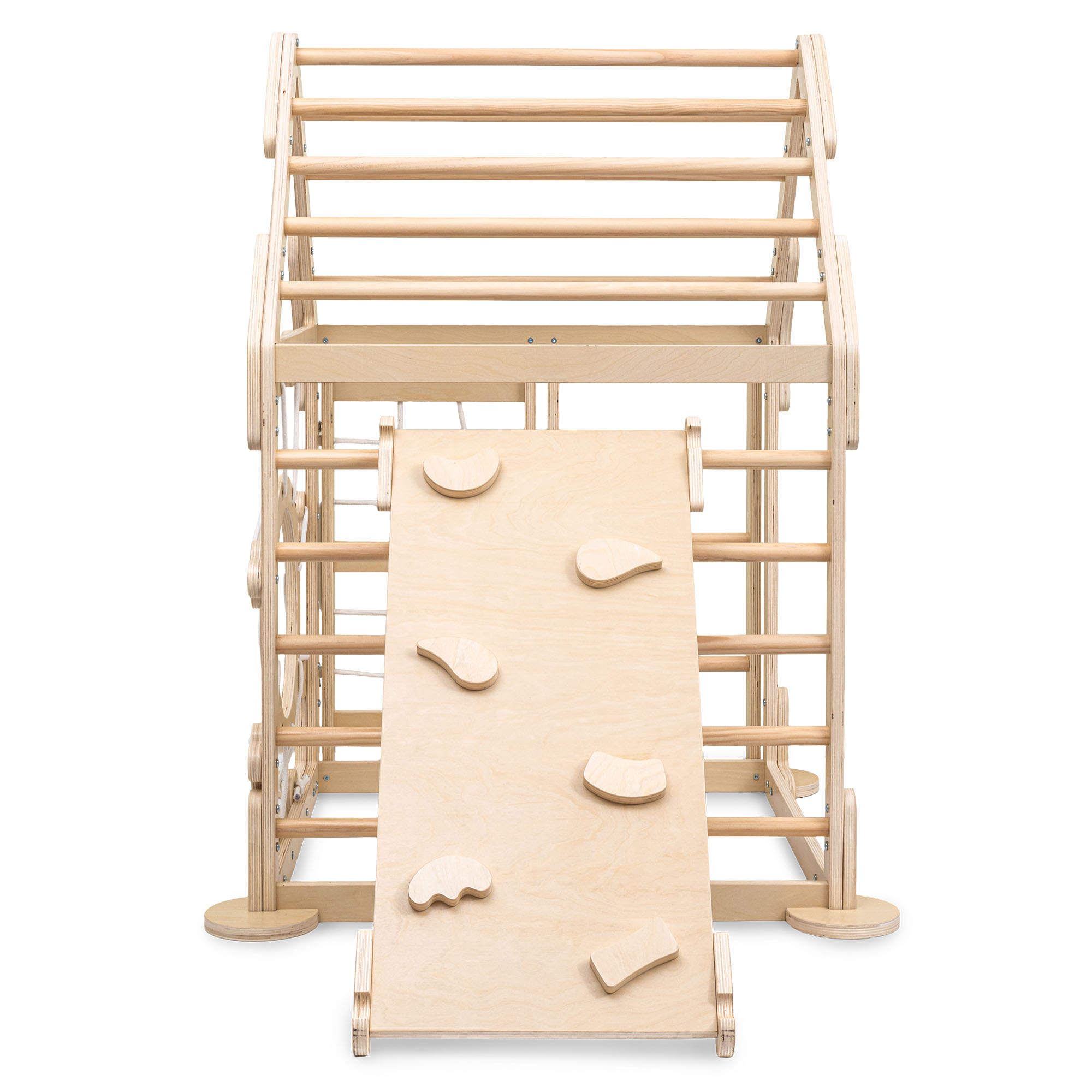 Осигурете на детето си истинска детска площадка... точно в собствената му стая! Дървената къща за катерене Mamabrum съчетава гимнастическа стълба, стена за катерене, мрежа, кръгъл отвор за катерене и покрив за катерене. Нейната многофункционалност я прави център за дейности, който насърчава движението, развива физическата форма и осигурява часове забавление.