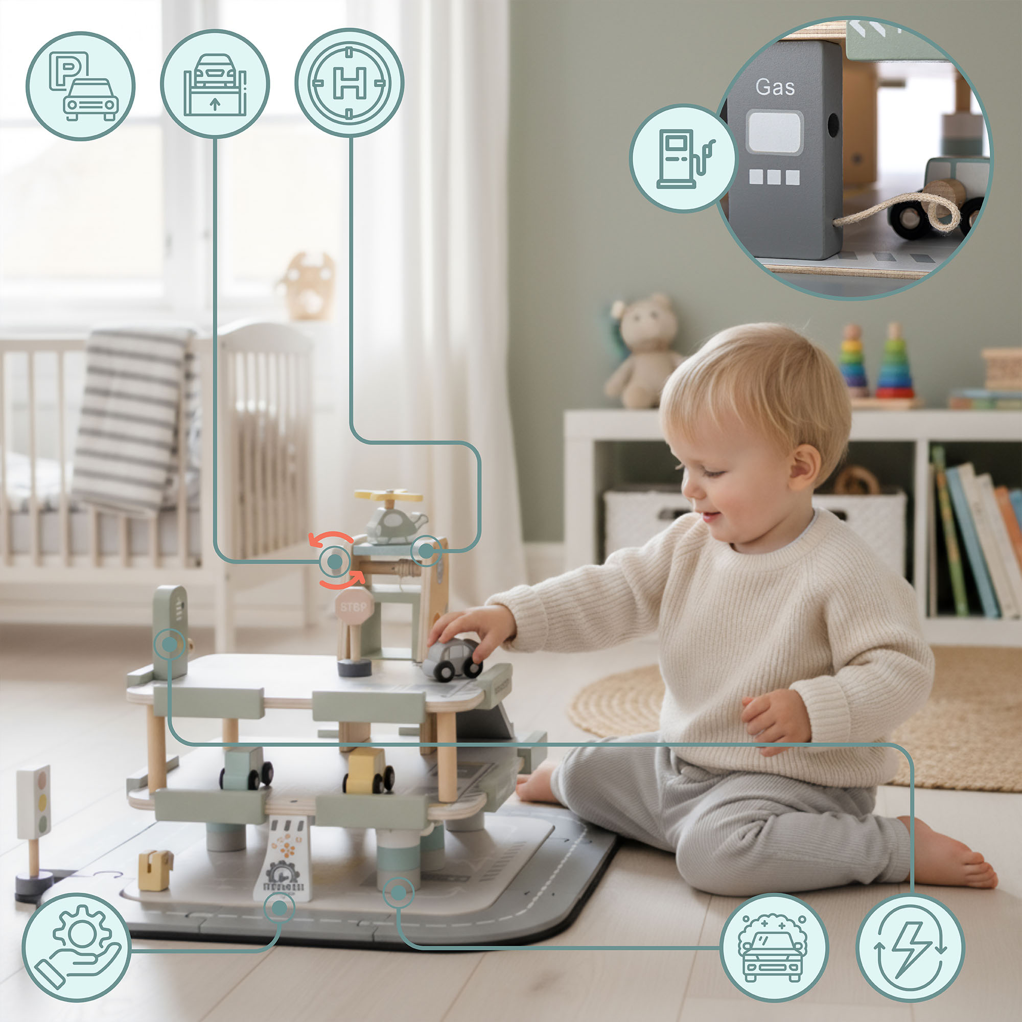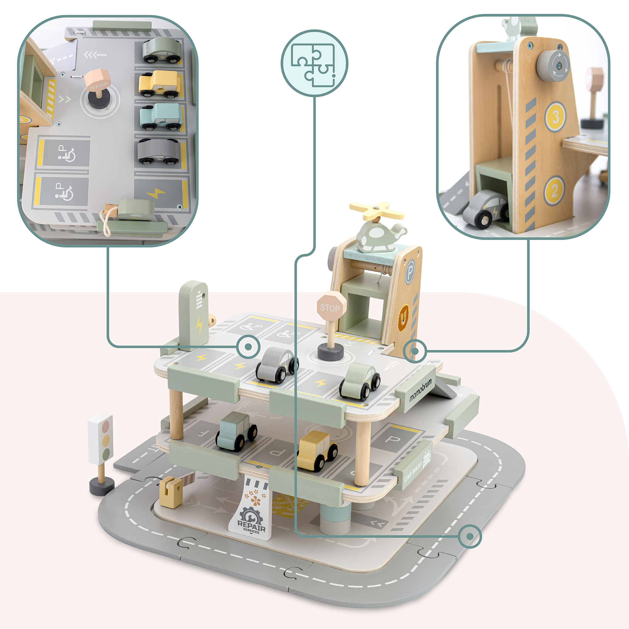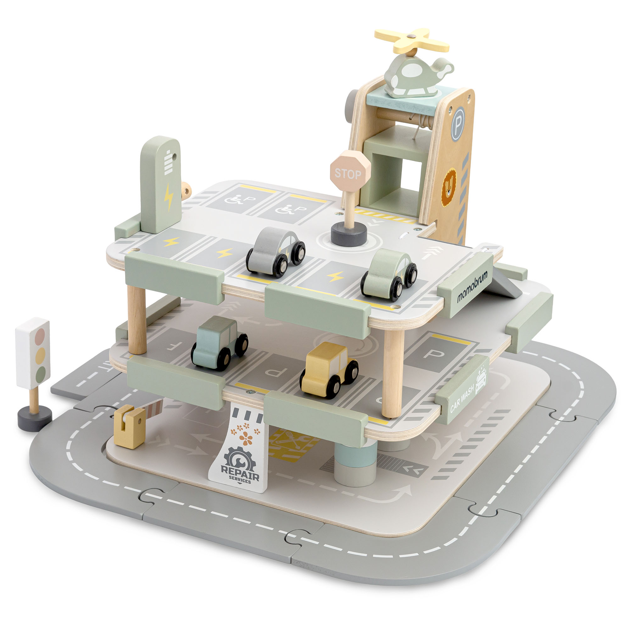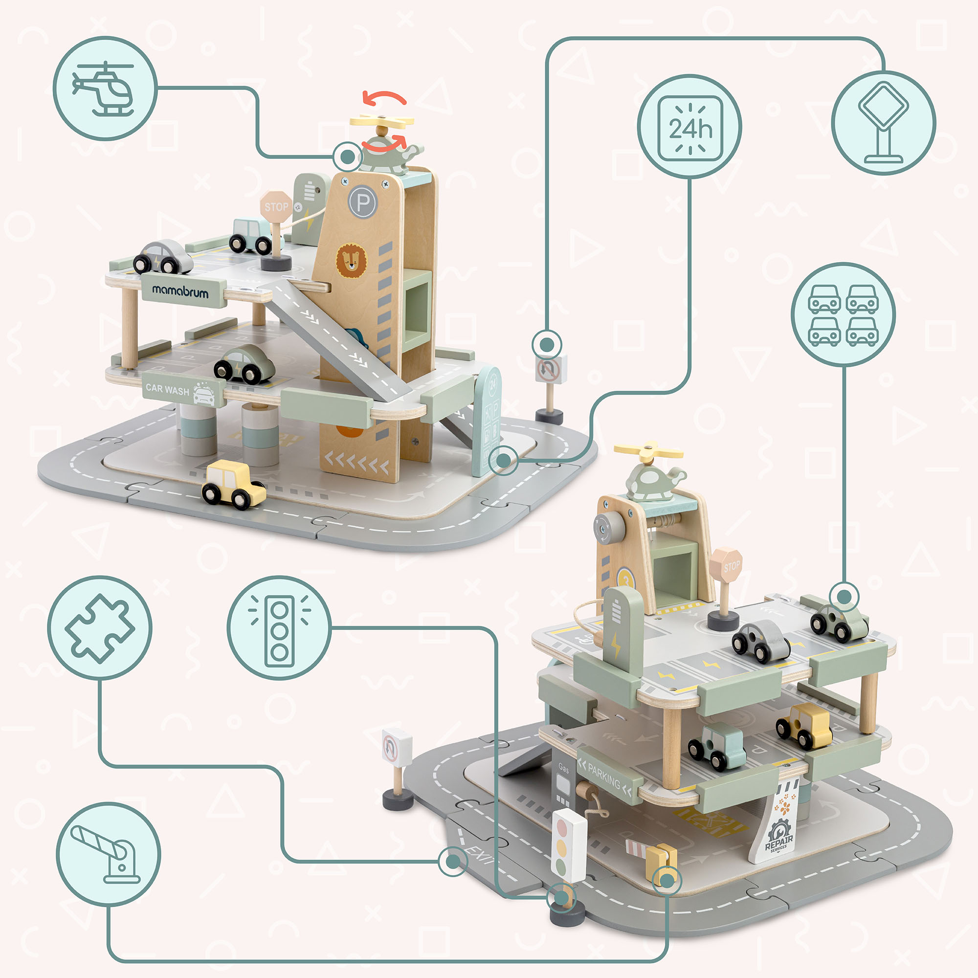 Дайте на вашето мъниче собствен автомобилен център! Дървеният триетажен гараж Mamabrum не е просто паркинг , но разполага и с бензиностанция, автомивка, сервиз, електрическа зарядна станция, мобилен автомобилен повдигач и площадка за кацане на хеликоптер . С широка гама от аксесоари, децата могат да създават безброй сценарии за игра - от ежедневни пътувания до вълнуващи градски приключения.