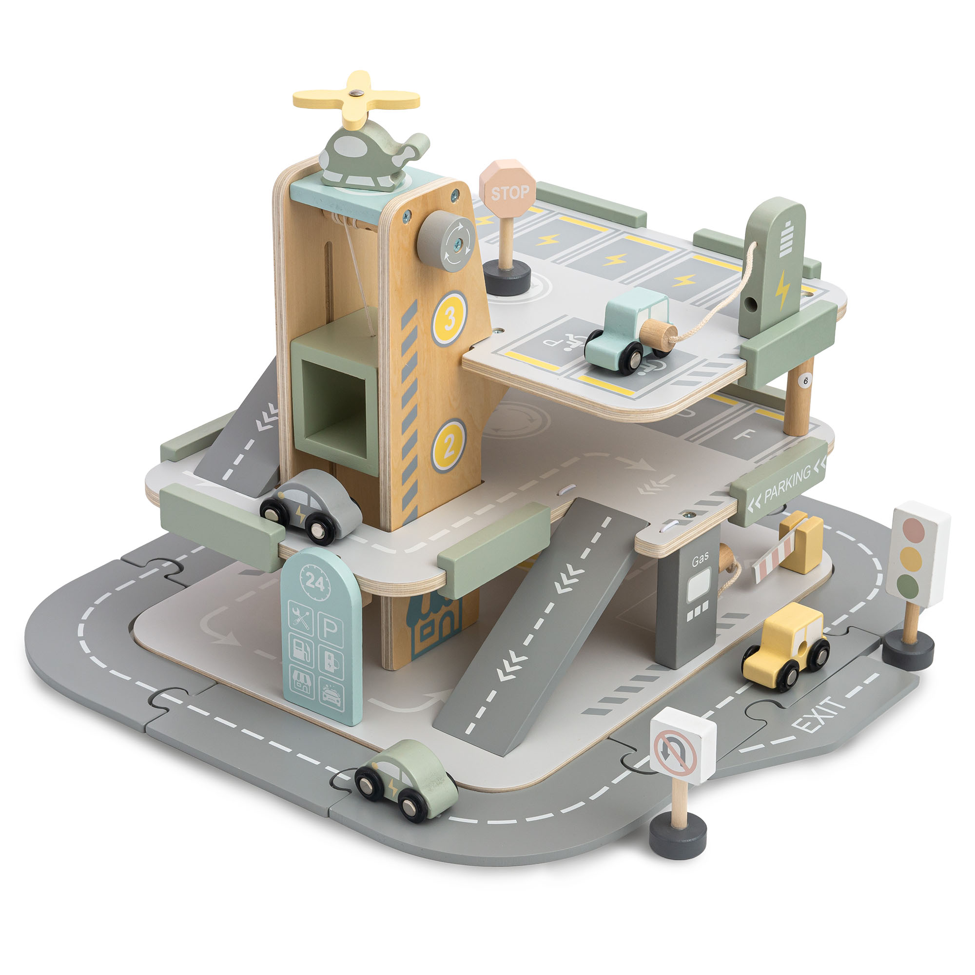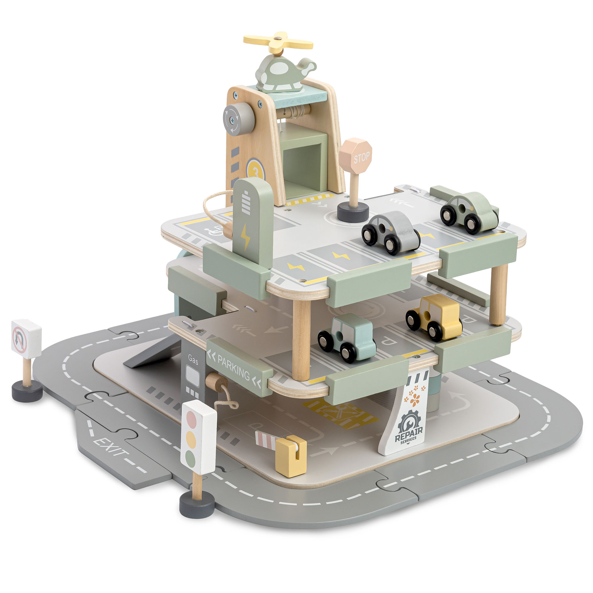 Дървен, триетажен гараж за деца с аксесоари – паркинг, бензиностанция, автомивка, хеликоптер