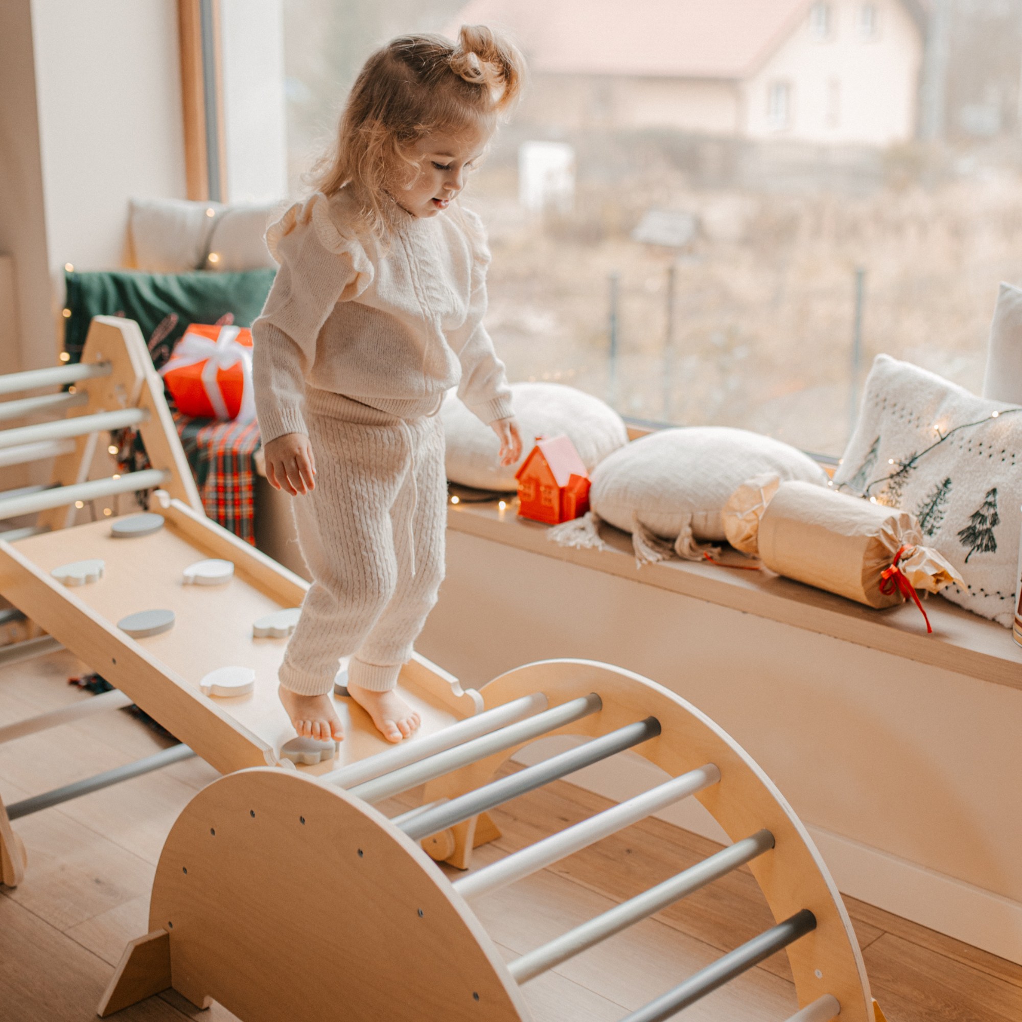 Тази дървена площадка за игра е идеалното решение за родители, които искат да осигурят на децата си ежедневна доза упражнения и забавление, без да напускат дома . Площадката се състои от триъгълник Пиклер, арка/люлееща се площадка и двустранна рампа, които могат да се комбинират в различни конфигурации . Това насърчава катеренето, балансирането, пързалянето и изграждането на писти с препятствия. Комплектът подпомага развитието на грубата моторика, координацията и самочувствието у децата.
