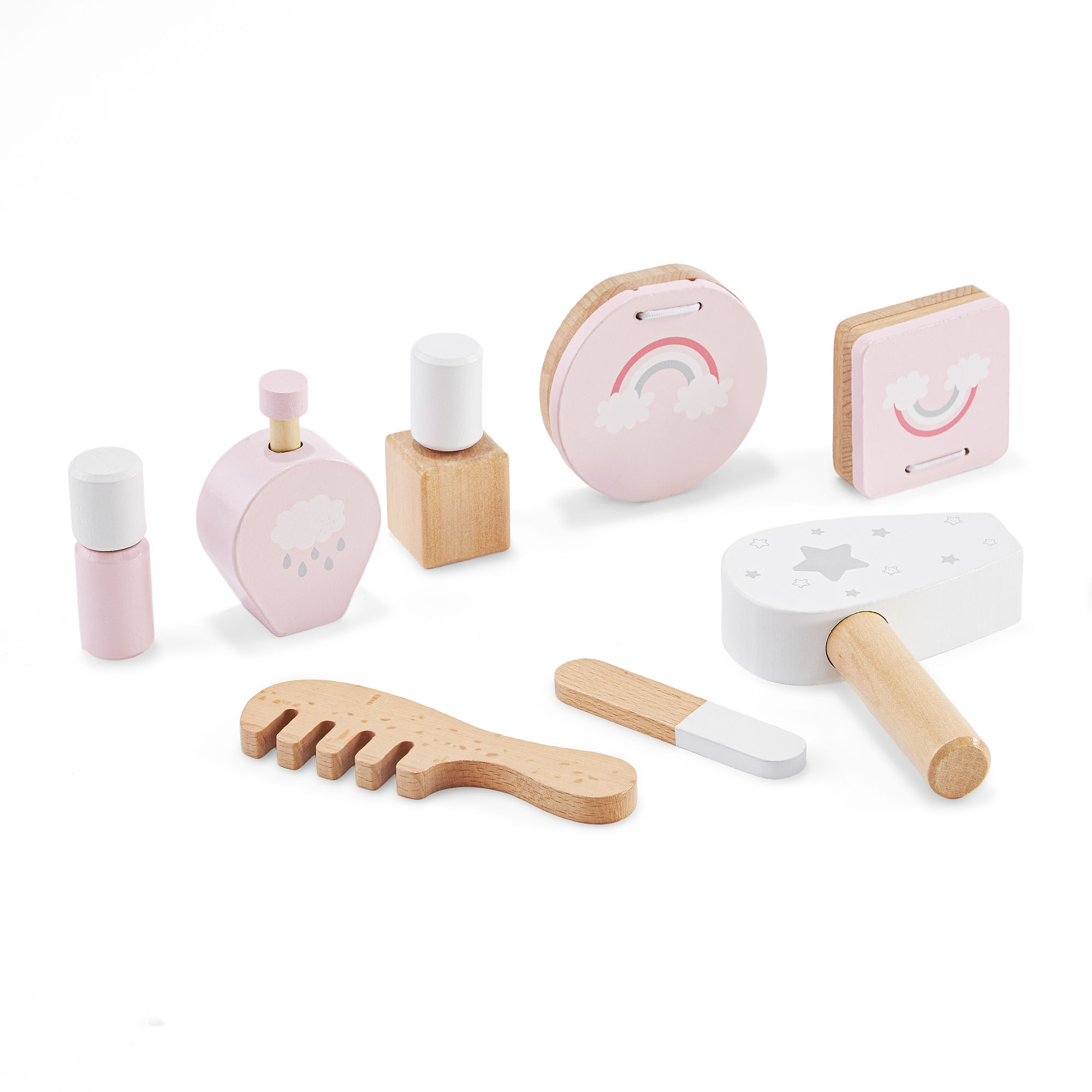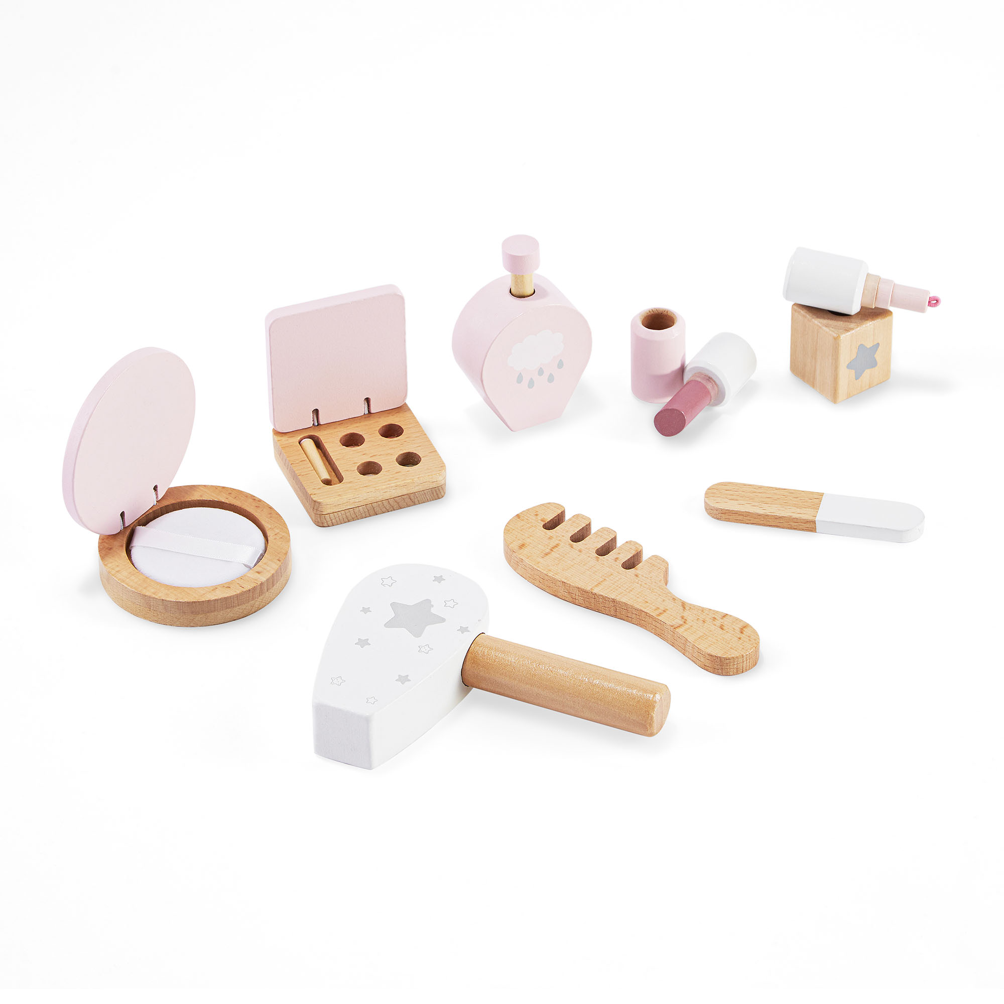 Комплектът съдържа цели 8 дървени аксесоара , които имитират истински козметични инструменти: палитра сенки за очи, лак за нокти, парфюм, пудра, гребен за коса, сешоар, червило и пила за нокти.
