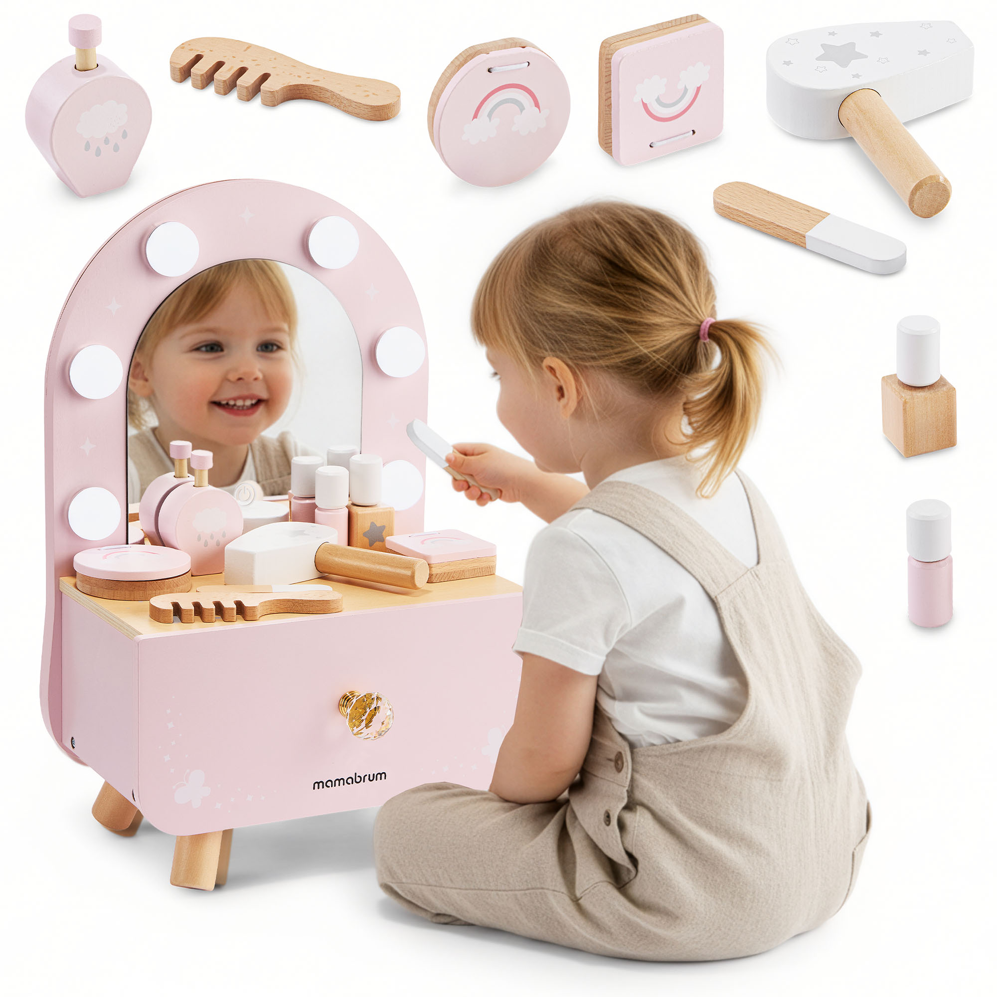 Децата могат да сресват косата на куклите си, да „гримират“, да организират свой собствен кът за красота и да се научат да организират аксесоарите, като ги съхраняват в просторното чекмедже. Това не е просто красив декоративен елемент – това е място, където децата могат да творят, откриват и изразяват себе си всеки ден.