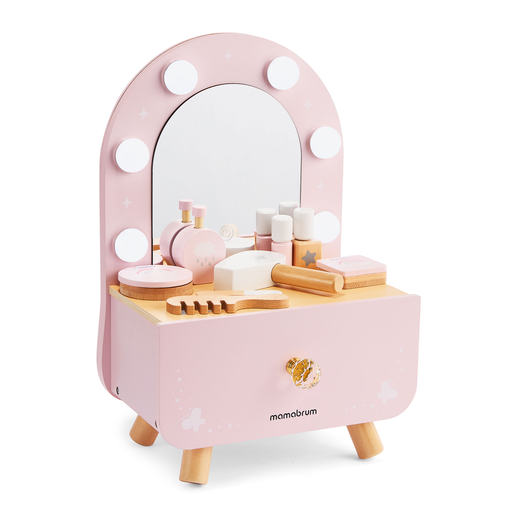 Тази очарователна, компактна мебел съчетава елегантност, функционалност и безопасна игра. Идеална е за деца, които обичат да имитират възрастни и да създават свои собствени магически ритуали за красота. С вградено LED осветление, реалистични аксесоари и компактен дизайн, тя внася нотка приказен блясък в детската стая - където и да отиде собственикът ѝ.