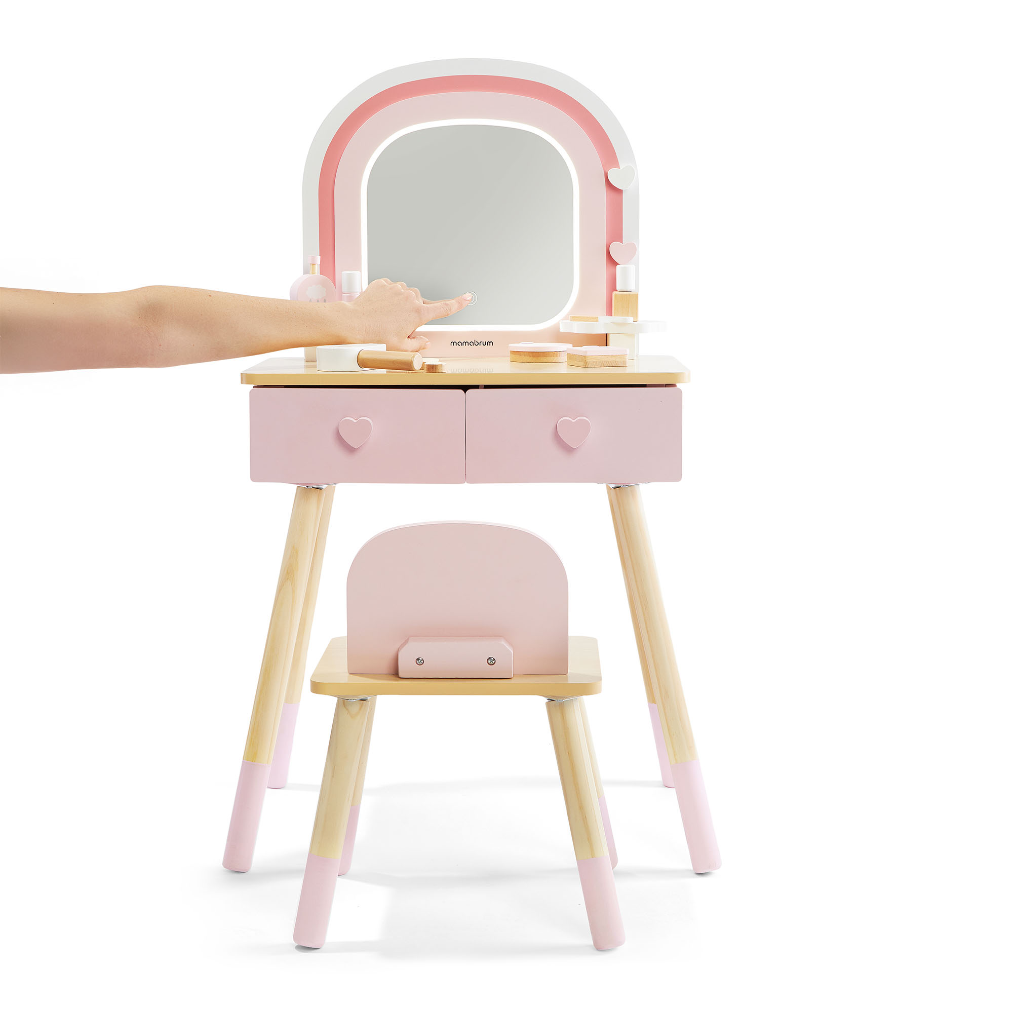 Огледалото на тоалетката е обградено от равномерна LED светлина, която осветява пространството и създава приятна, игрива атмосфера. Осветлението може да се контролира чрез сензорен бутон, разположен на огледалото – едно докосване е достатъчно, за да включите светлината и да регулирате яркостта ѝ на няколко нива. Това позволява на децата да регулират интензитета на осветлението според своите нужди – от мека вечерна светлина до ярка светлина за игра и стилизиране.