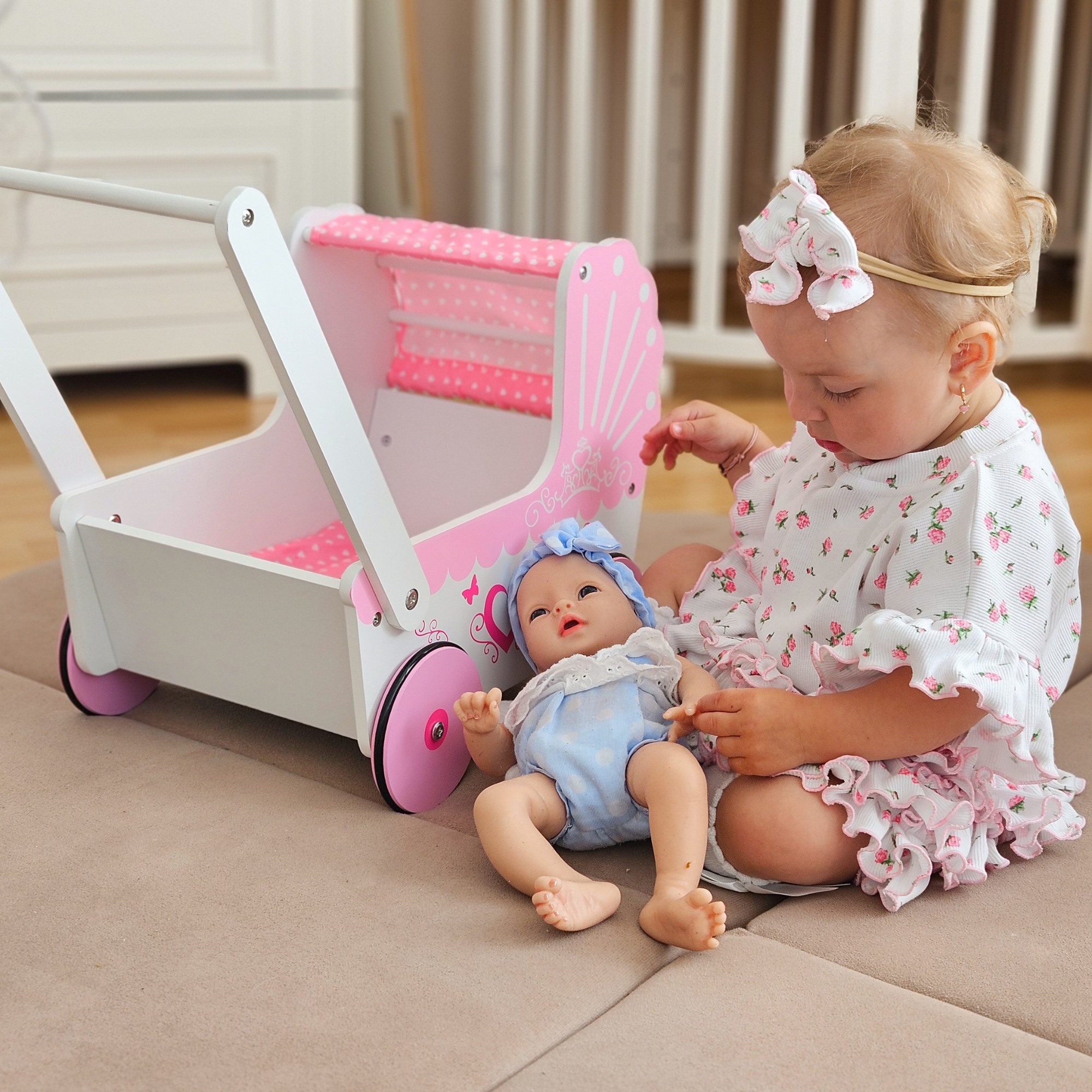 Сега тя може да ги вземе със себе си на разходка в тази очарователна количка. С количка като тази всяка малка принцеса ще се превърне в грижовна майка, която се грижи за любимите си кукли.