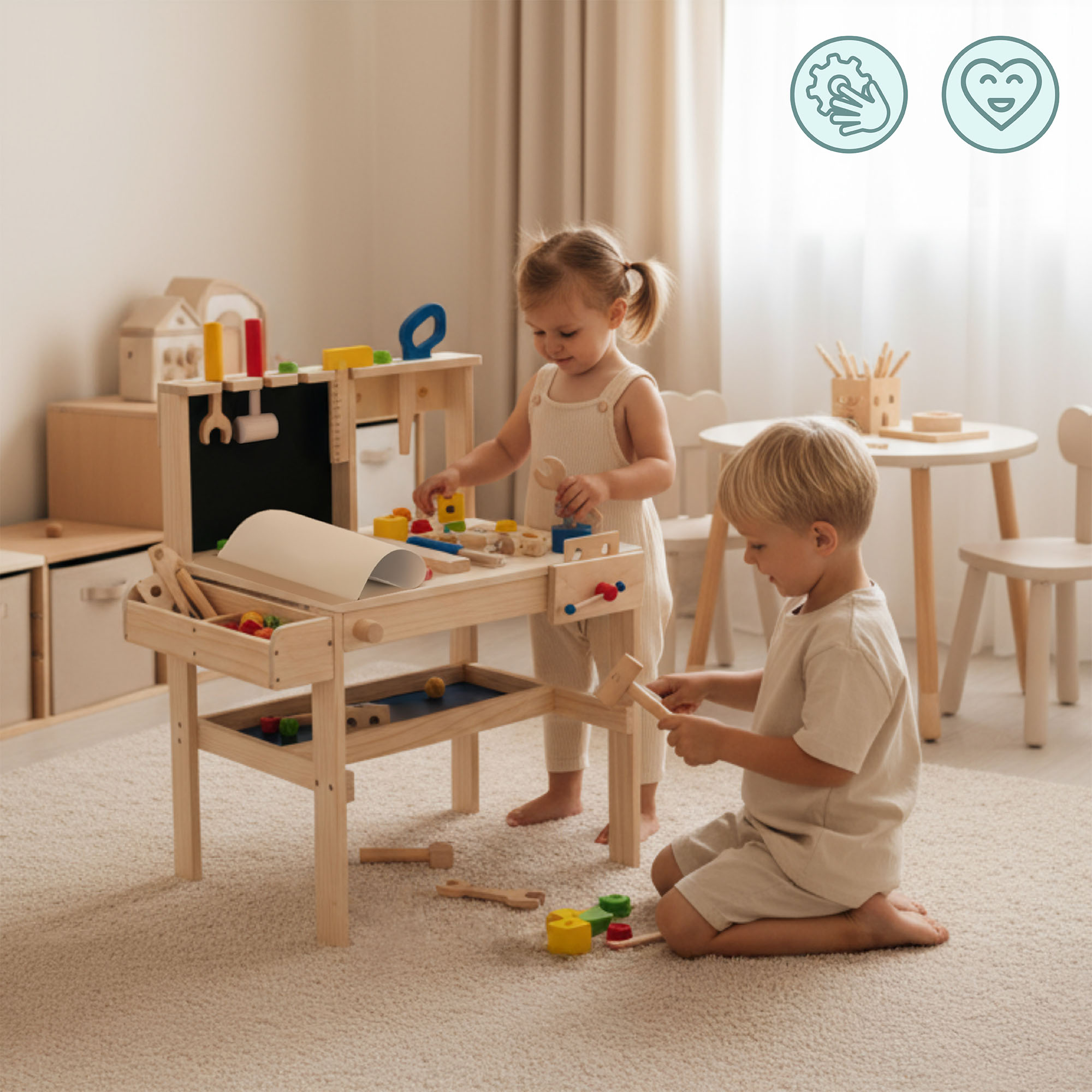 Красивият дървен комплект "Направи си сам" е чудесна играчка, която позволява на вашето малко дете да развиване на ръчни уменияда научите повече за инструментите и тяхното използване. Децата обичат този вид игра!