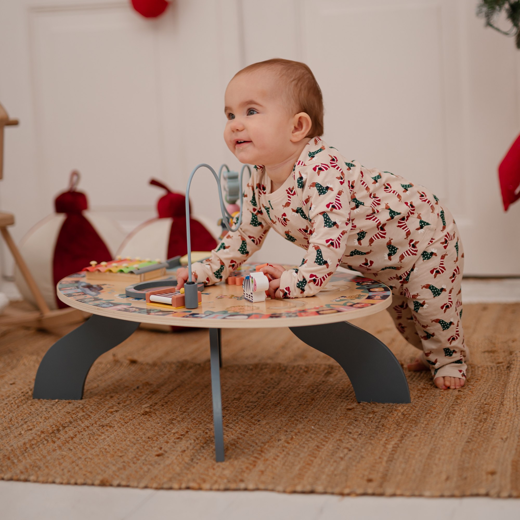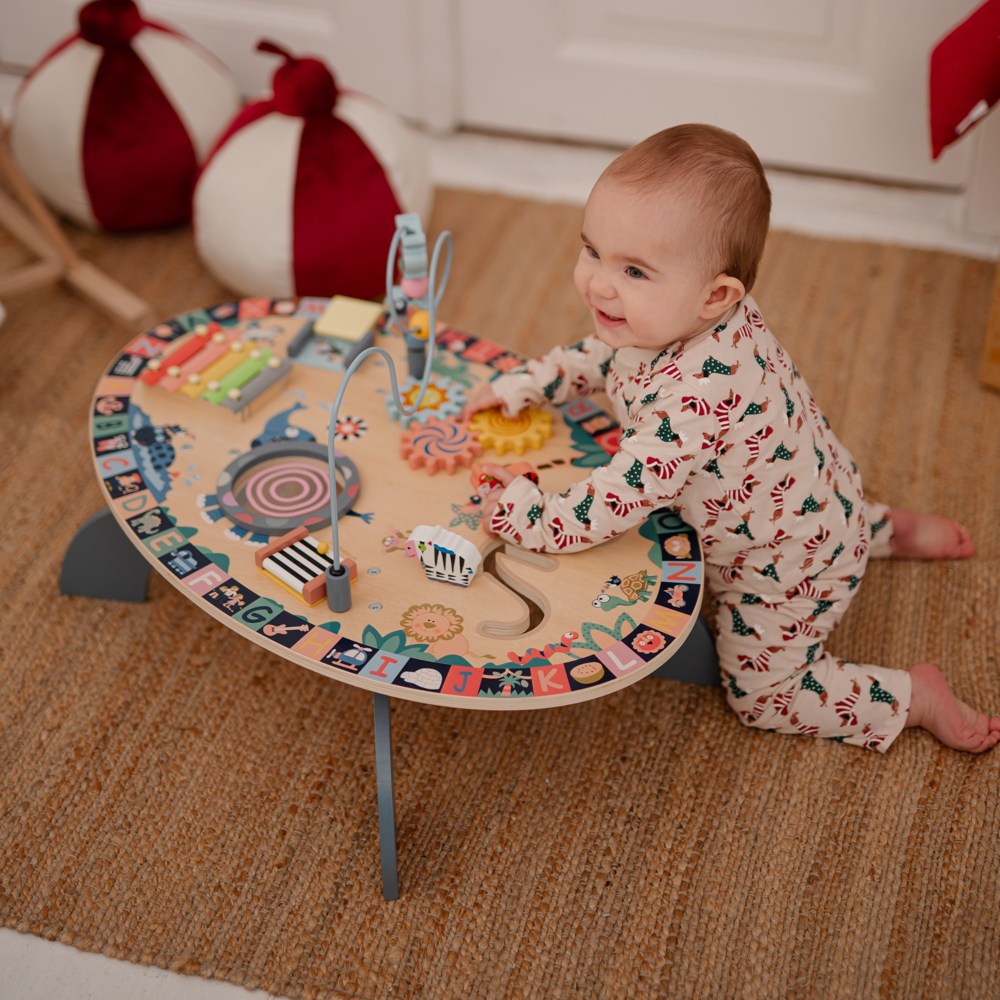 Масата включва много образователни елементи за игра, като лабиринт от мъниста, фигурки на животни, които да се движат по зададен маршрут, движещи се зъбни колела и врата "акуку"! Децата могат да изследват необичайните функции на тези играчки, което насърчава творческото мислене и откриването на нови възможности. Чрез играта малчуганът подобрява двигателните и познавателните си умения. Такава чудесно проектирана играчка осигурява не само чудесно прекарване на времето, но в същото време и забавно и лесно учене!