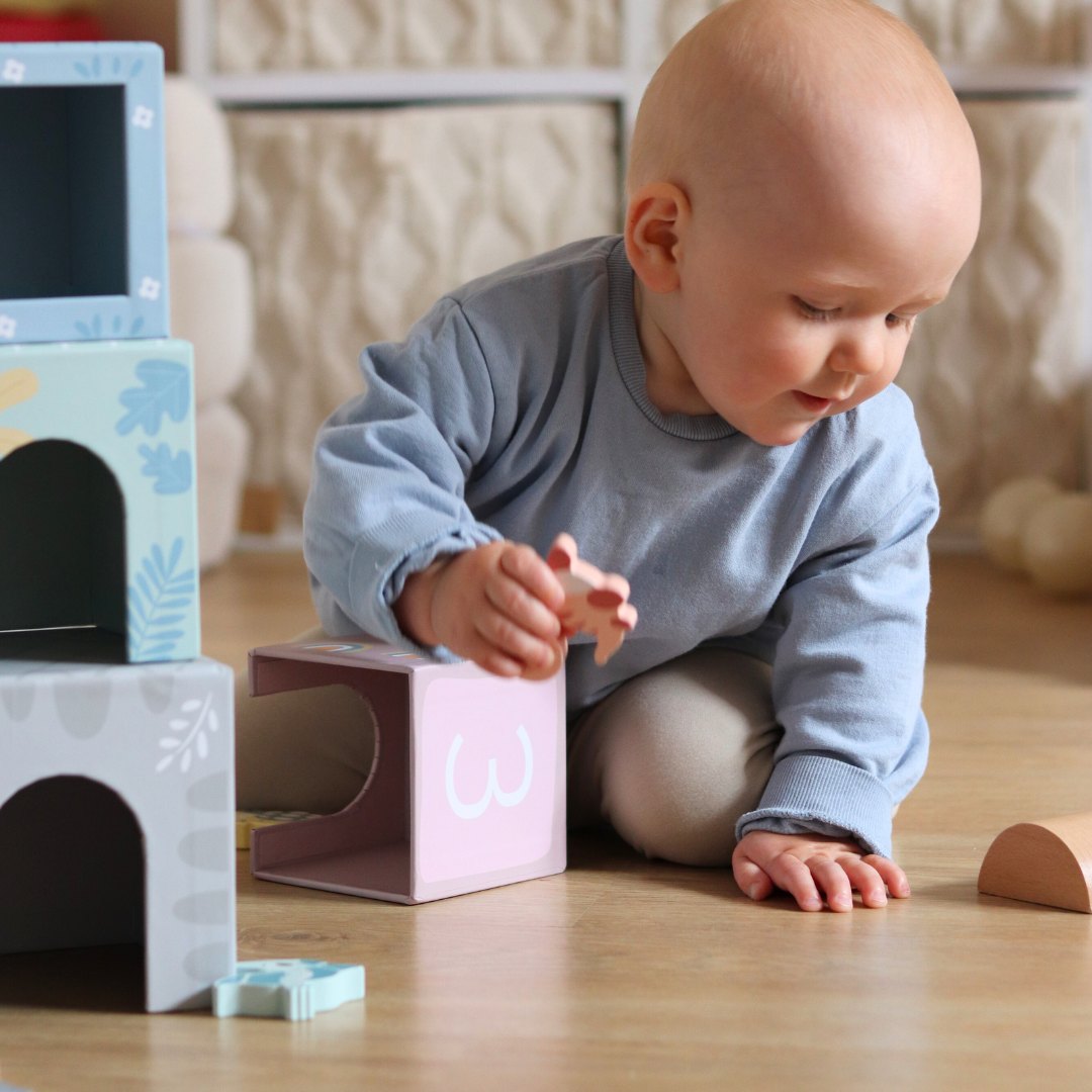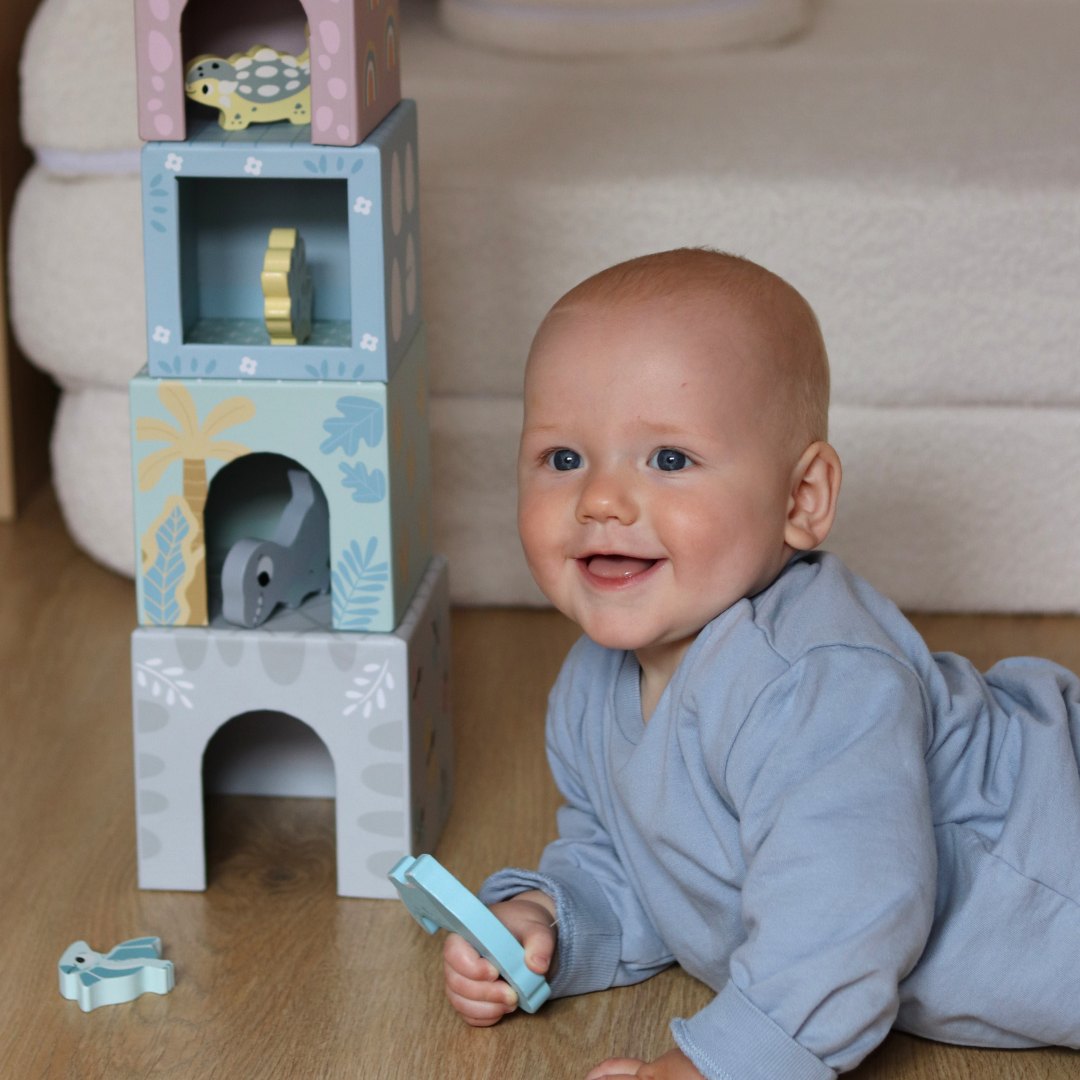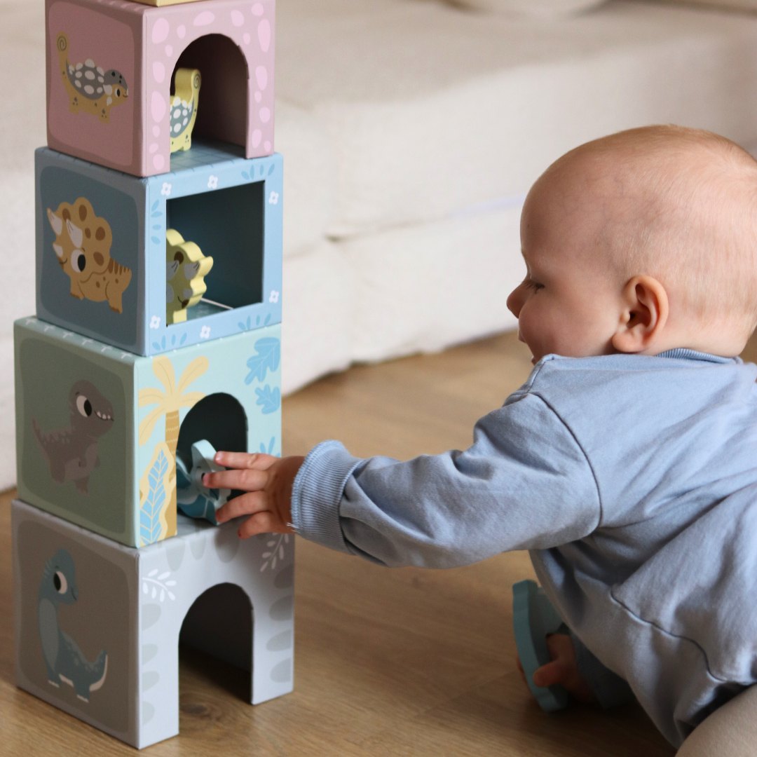 Тази играчка със сигурност ще осигури на вашето мъниче много забавления! Всичко, което трябва да направите, е да построите пирамида от картонени кутии, а след това да поставите съответния динозавър във всяка кутия. Цветният печат върху кутиите служи като подсказка за вашето дете. Малчуганът може не само да построи кулите, но и да използва играчката по много различни начини, развивайки своята креативност в този процес.