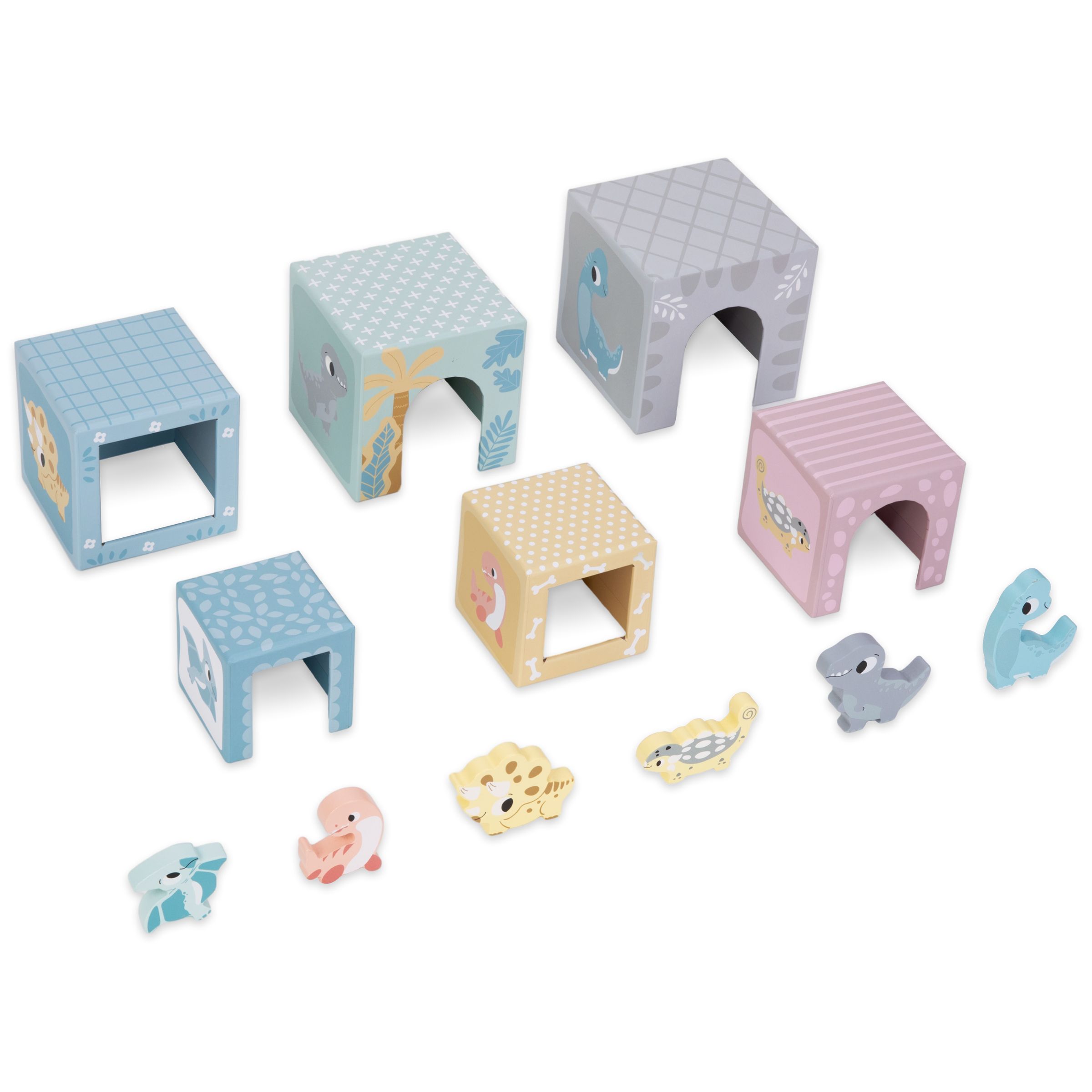 - комплектът се състои от 6 картонени кутии с различни размери, номерирани от 1 до 6, и 6 дървени динозавъра